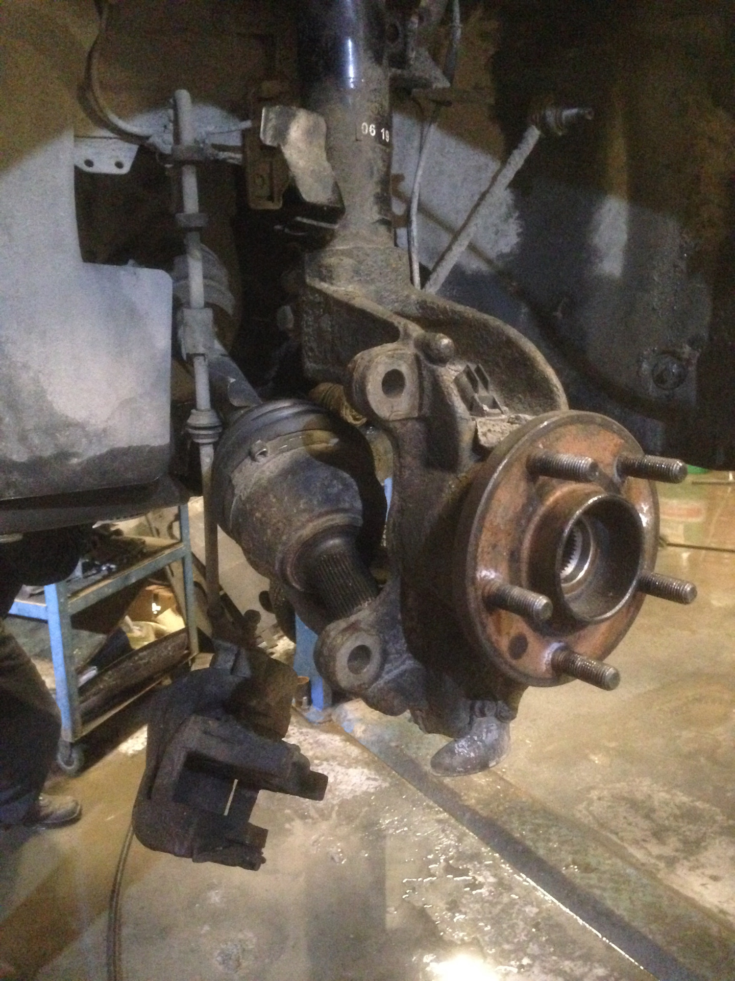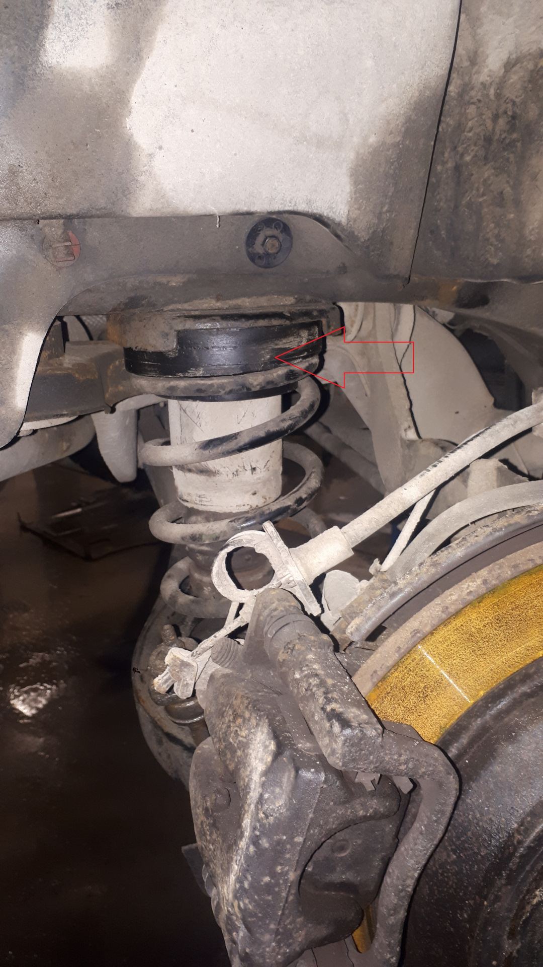 Krok 3 — Przód: zdejmij koło i odczep przewody/czujniki (ABS, hamulec) z uchwytów na kolumnie, aby ich nie naciągnąć. — Ford Mondeo Mk4 FL