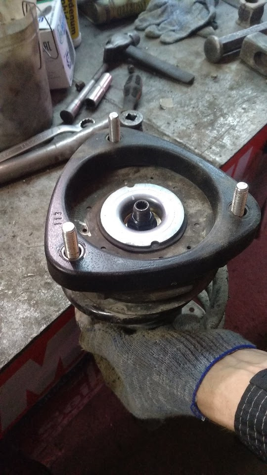 08. Przód: wybij fabryczne szpilki z górnej poduszki (prasa lub młotek przez tuleję). — Hyundai Santa Fe TM.